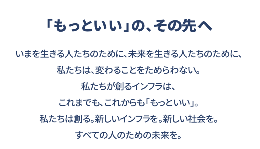 このブランドメッセージ(コンセプトワード)は 「私たちは社会や経済の環境変化に適応したインフラサービスの提供だけで満足せず、 いまを生きる人々にとって、当たり前の日常を『もっといい』ものにし、 未来にわたって続く『もっといい』を、ただひたすらに追い求める」という、 当社の志(こころざし)を表現したものです。